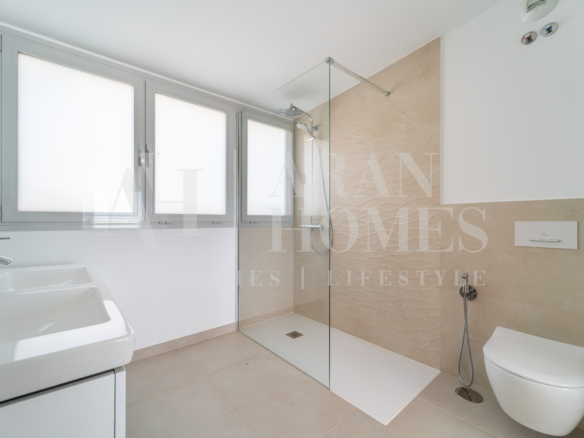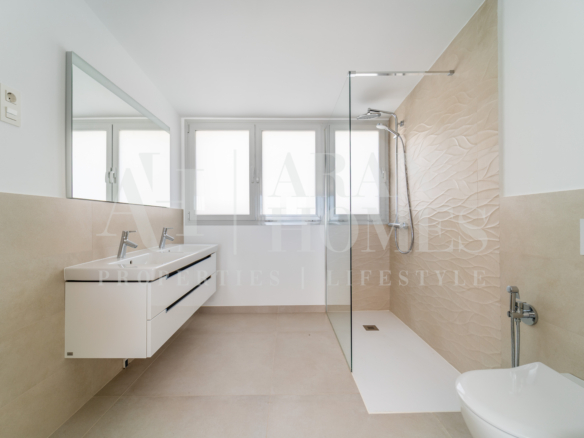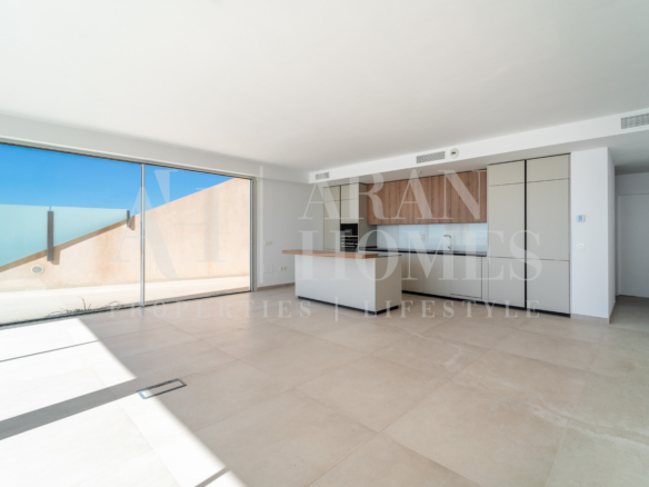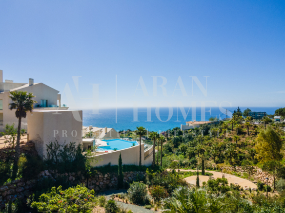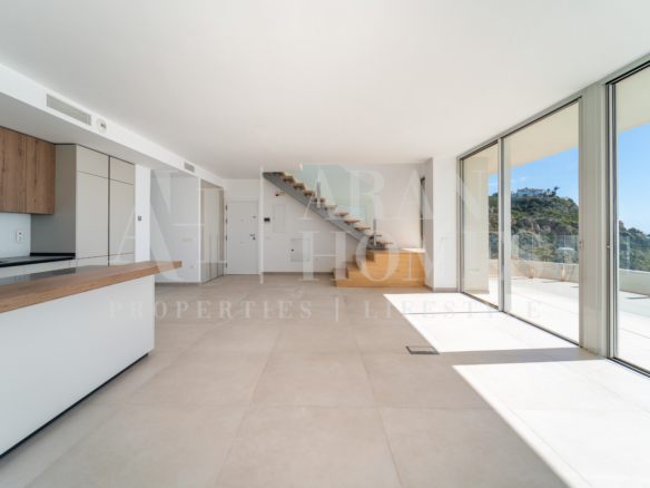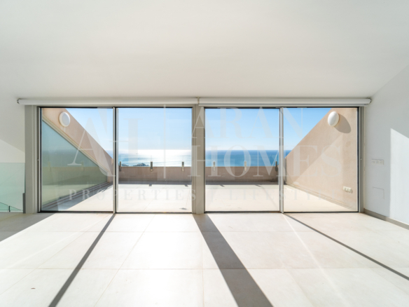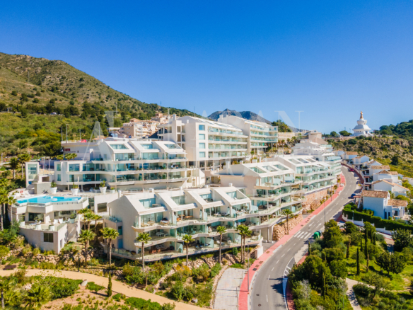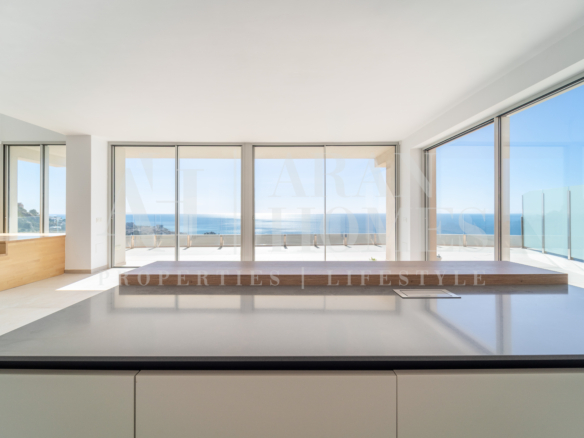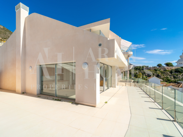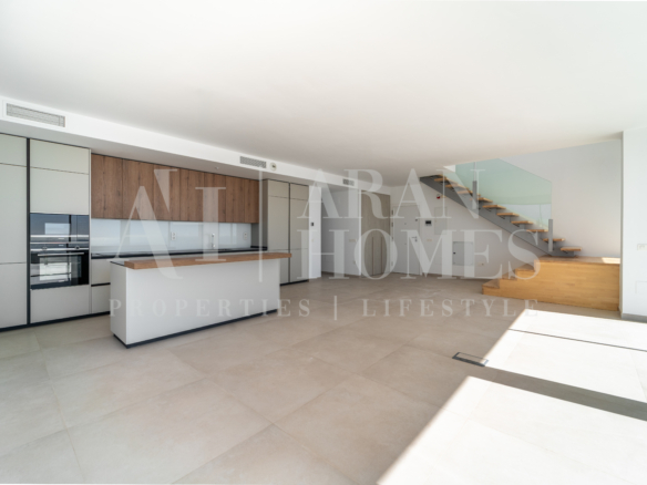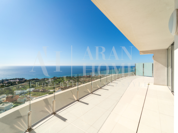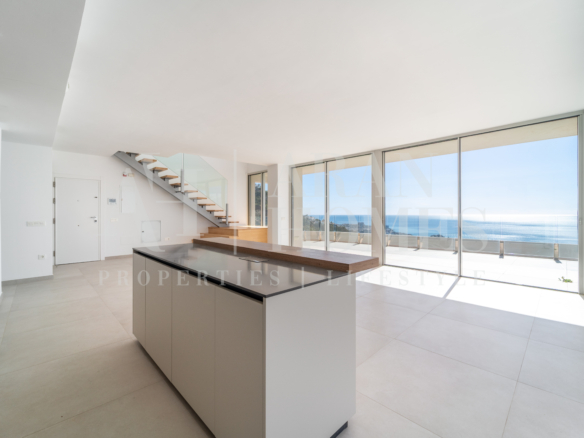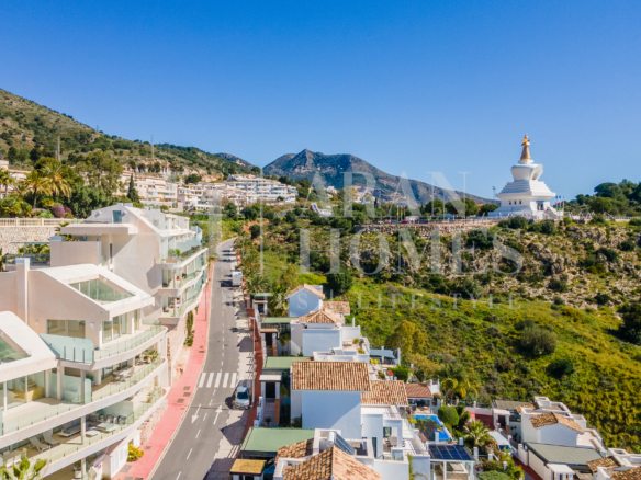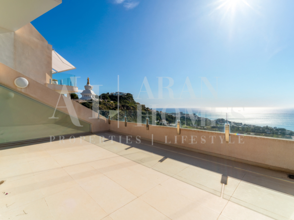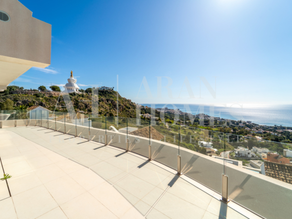 Brand new south facing penthouse duplex, located in the exclusive urbanization of Stupa Hills. The property consists of hall, 3 bedrooms with built-in wardrobes and electric blinds, bathroom and guest toilet, open plan kitchen fully furnished and equipped with electricial appliances from Siemens. Spacious living-dining room that leads out to a terrace of 65m2 with panoramic sea views, the Fuengirola Bay and of the Buddist Temple. On the top floor is located the main bedroom with walk-in closet, ensuite bathroom and laundry area. The bedroom leads out to a terrace of 21m2 with panoramic sea views. Air conditioning hot and cold with Airzone, video intercom, domotic system, pre-installation alarm system. Includes two parking spaces and one storage room.
