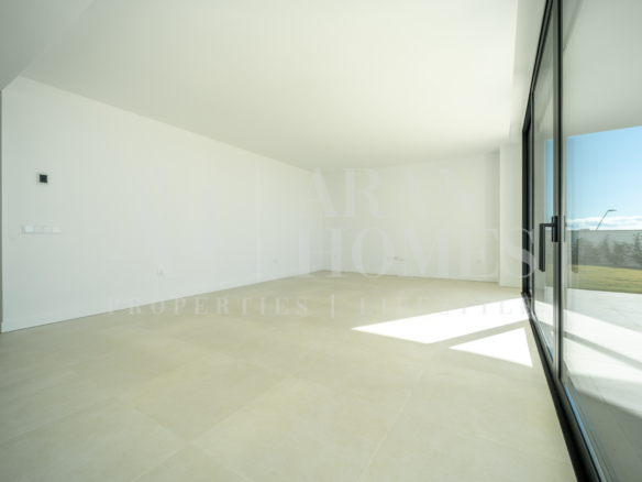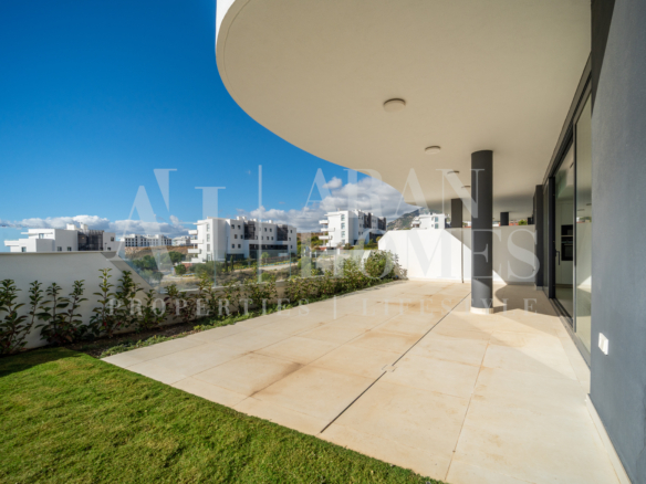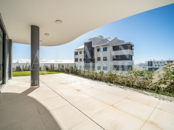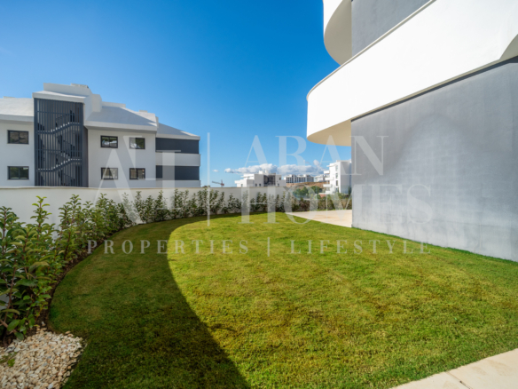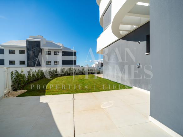 This brand new luxurious corner garden apartment is situated in the prestigious Higuerón West urbanization and features two bedrooms, two bathrooms, a generous living-dining area, and an open-plan kitchen that is fully furnished and equipped with electrical appliances. It also includes a laundry area with a washer/dryer.