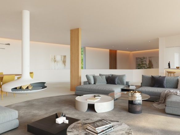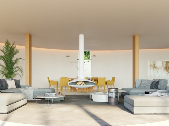THE SPLENDOR OF THE LIVING ROOM- The simplicity of its circular silhouette and the wise combination of materials are the keys to Bay 7. The celebration of a quiet life, with views to the exterior pool merging with the Mediterranean sea.